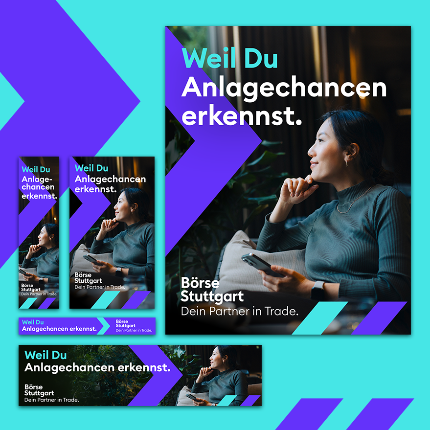 In einem Marken-Workshop schärfen wir das Profil der Börse Stuttgart und definieren ihre Differenzierungsmerkmale. Daraus entsteht die kreative Leitidee „Weil Du …“ – und die Kampagne, die die Zielgruppe in ihren Entscheidungen bestärkt und die Vorteile des Handelsplatzes auf den Punkt bringt.