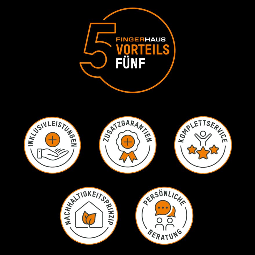 Kann man zu viele attraktive Benefits haben? Nicht, wenn man sie smart clustert. Daher haben wir die FingerHaus VorteilsFünf etabliert. Fünf Bereiche, die mehr als 70 Mehrwerte von FingerHaus für Interessent*innen und Bauherren übersichtlich zusammenfassen.
