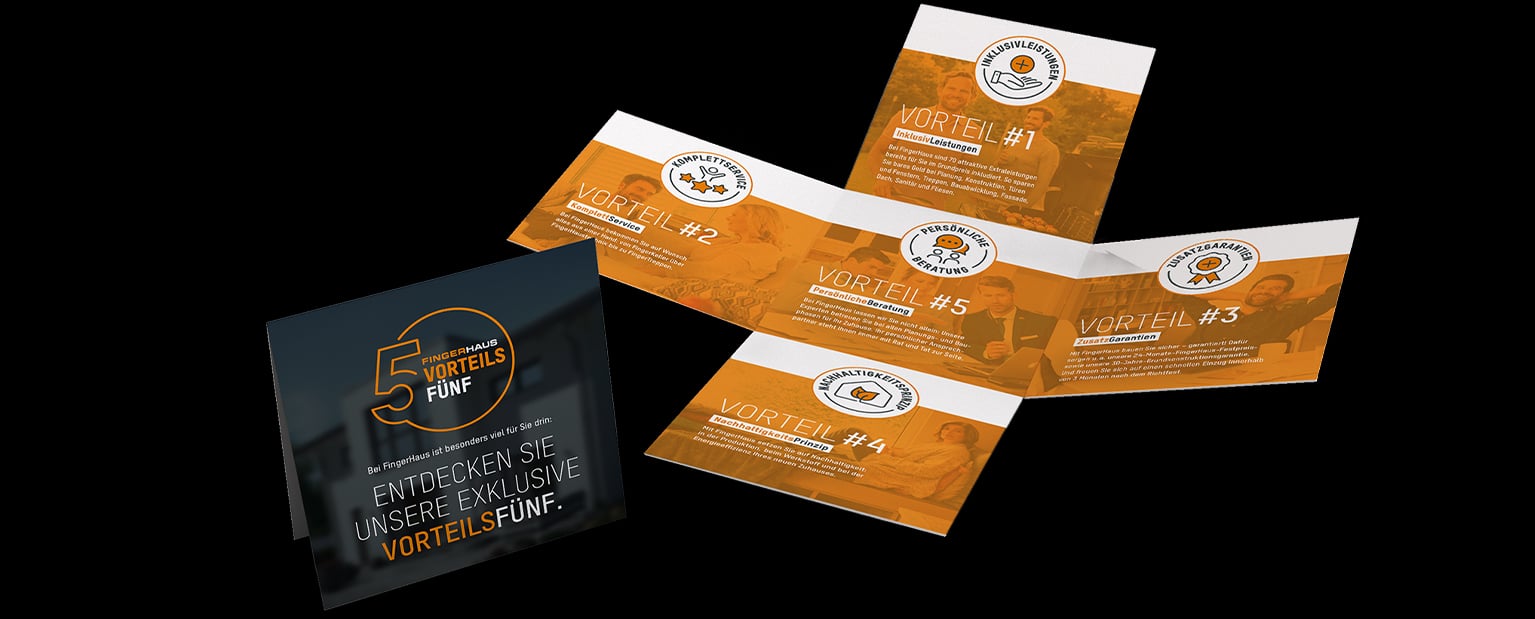Übersichtlich, unterhaltsam und ungewöhnlich: mit der VorteilsFünf-Klappkarte verwandeln die Fachberater*innen theoretischen Mehrwerte in praktisch erlebbare Verkaufsargumente. Ein Werbemittel, so vielschichtig, wie die Entscheidung fürs passende Finger-Haus.