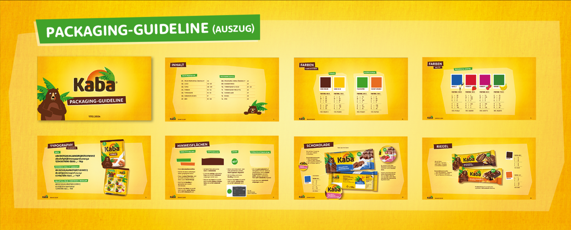 Klare Strukturen für Kaba! Die Definition von Logos, Farben, Typo, Hinweisflächen sowie einheitlichen Gestaltungsrastern für Beutel, Tafel und Riegel bietet die perfekte Basis für ein rundum konsistentes Markenbild.
