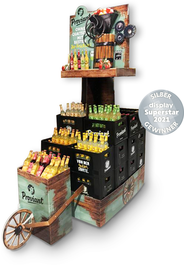 So erzeugen wir literweise frischgepresste Abverkäufe: Die Fruchtpresse ergänzen wir um frisches Obst, Produkte und eine authentischen Holzschütte. Der schonende Herstellungsprozess und die Natürlichkeit der Zutaten sind die zentralen Platzierungsthemen. Award-verdächtig, wie nicht nur die Shopper finden!