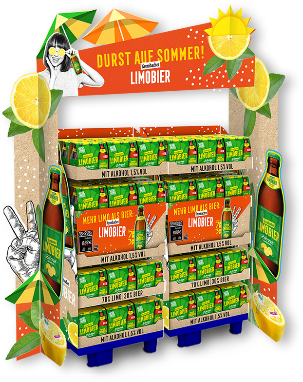 Mit der Sommerplatzierung liegt Limobier am POS genau richtig! Das Display mit auffällig viel Fernwirkung bietet die perfekte Gelegenheit für entspannten und erfrischenden Limobier-Genuss. Dabei sind wir auch noch besonders effizient, denn wir setzen auf Höhe statt nur auf Fläche. Da geht die Sonne auf.