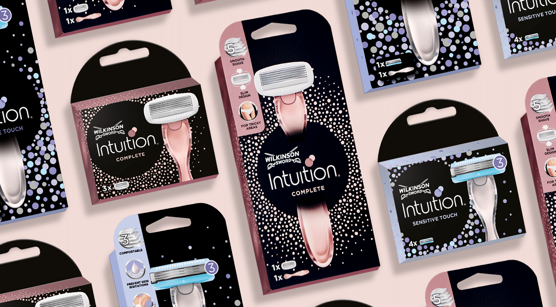 Bye bye, störende Härchen! Und Hallo, samtweiche Haut. Der neue Complete und der Sensitive Touch erweitern das Intuition Portfolio unseres langjährigen Kunden Wilkinson um zwei Produkte, die jede tricky area mühelos erreichen und gründliche Ergebnisse garantieren. Zur Einführung haben wir das Packaging beider Rasierer entwickelt. Beim Complete kommen noch Key Visual sowie diverse Onlinebanner on top.